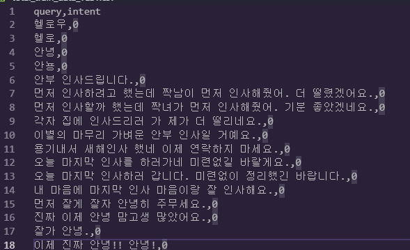 문장,0 << 문장과 의도 번호만 나오도록 뽑아내서 저장시키면 끝이다.